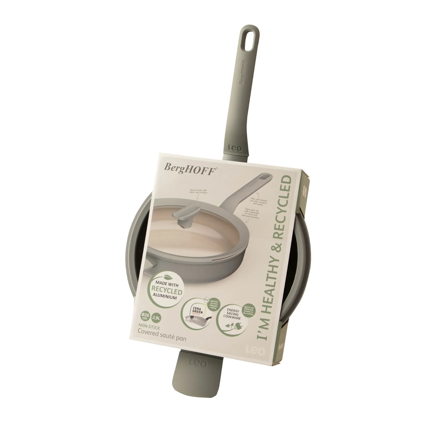 BergHOFF 3950426 Balance Moonmist is a 26 cm covered non-stick pan made with 100% recycled aluminum, featuring a ceramic coating, glass lid and full cooktop compatibility including induction.
