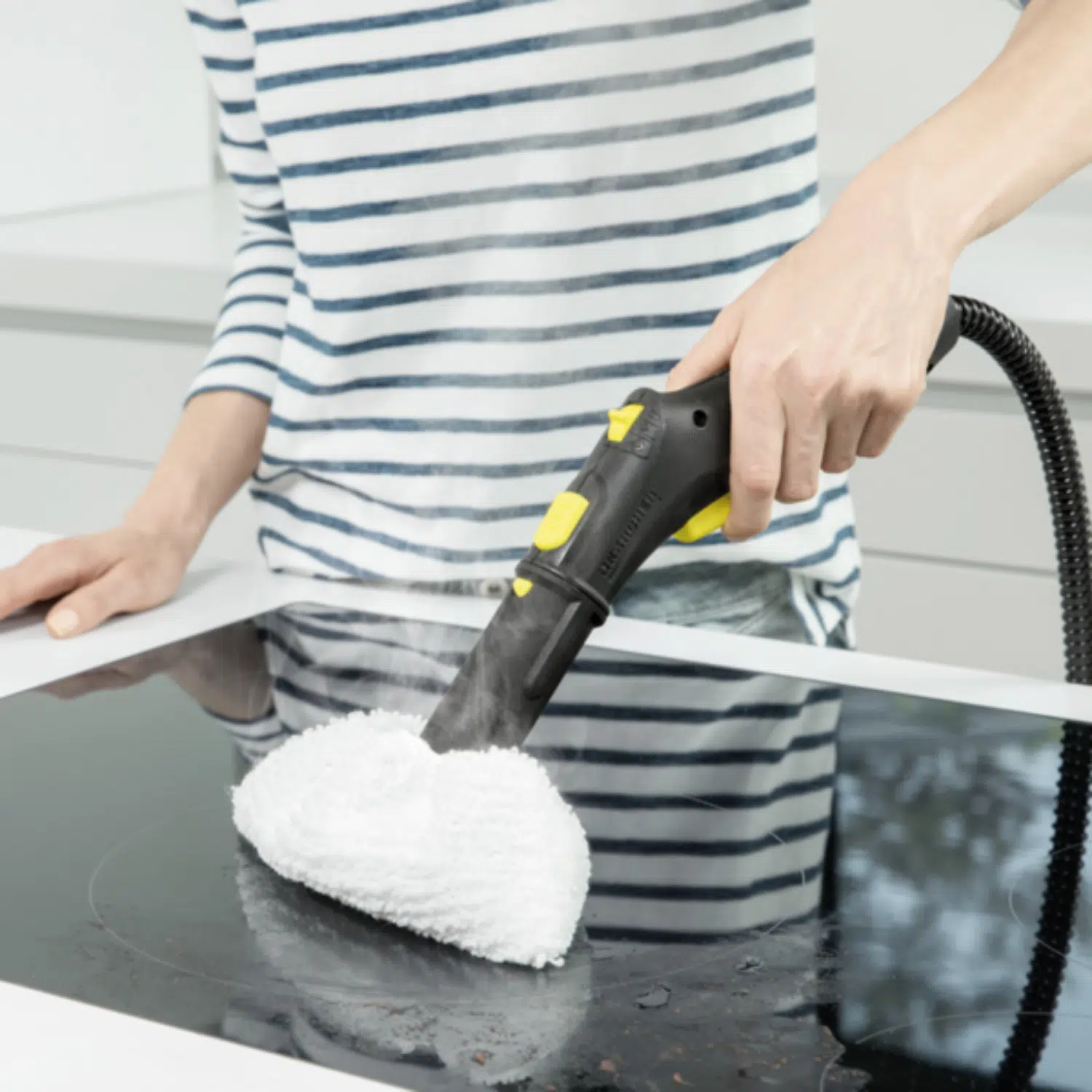 Karcher SC2 EasyFix – 1.512-604 is a steam cleaner with a 1500 W boiler that generates 3.2 bar steam, uses a 1-liter tank with ~6.5-min heat up, and comes with the EasyFix floor nozzle and accessories to deep-clean hard surfaces hygienically without chemicals.