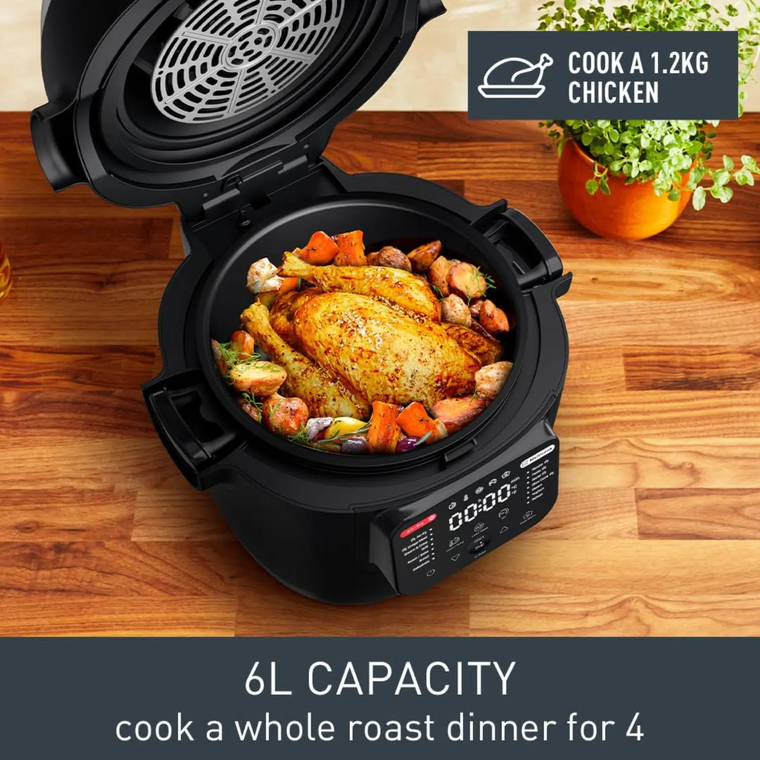 - 14 automatic cooking programs covering air-frying, grilling, baking, roasting, bread, slow cooking, risotto, pasta, sauté, steam & crisp, dehydrate, reheat, etc.
